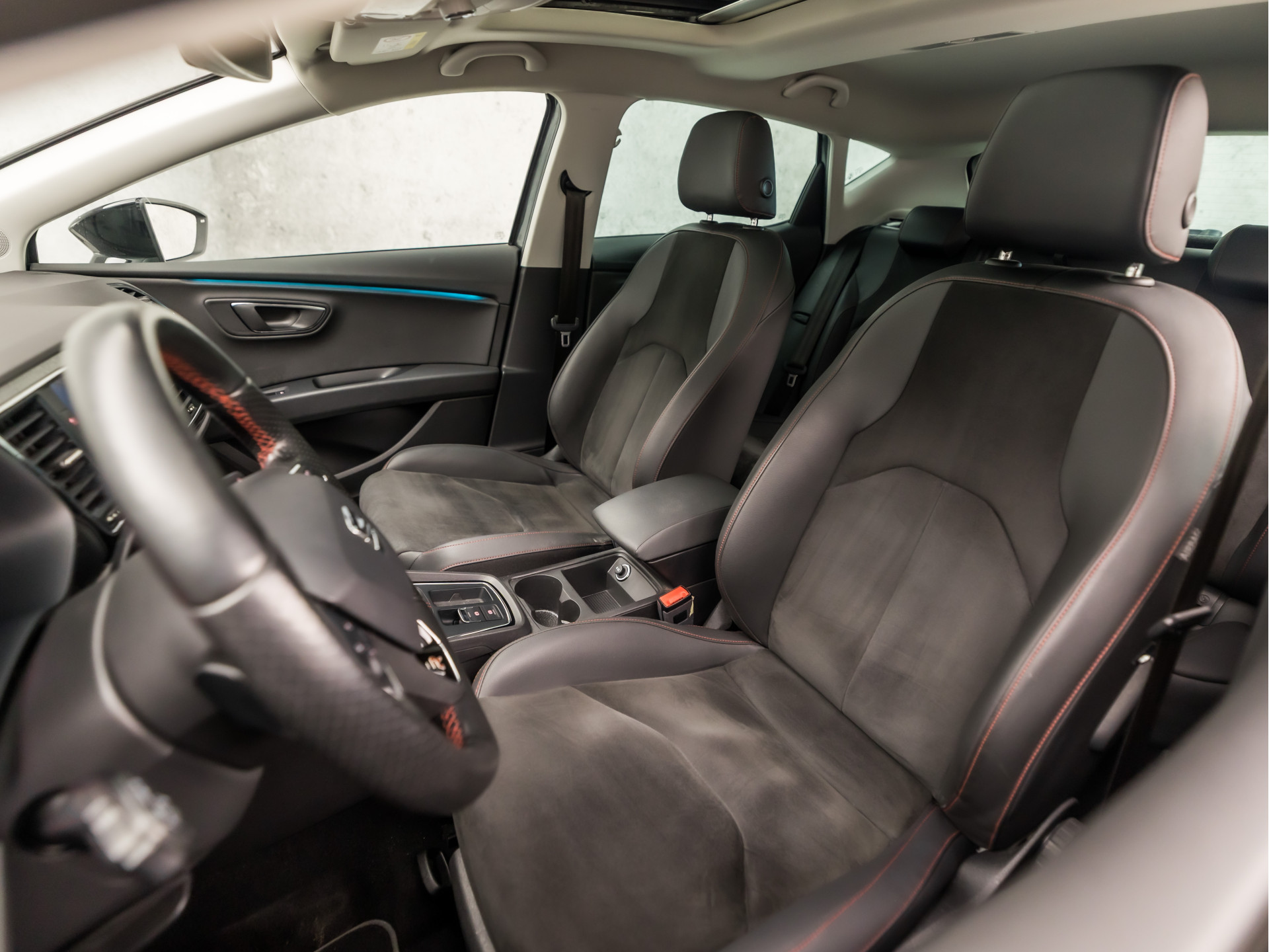 Omdat rijden een plezier mag zijn, staat deze SEAT Leon enthousiast te glimmen in de showroom. Technisch in topconditie, strak in de lak... echt een droomauto! In deze auto vindt u een benzinemotor en een automatische transmissie. Het interieur ademt luxe door de leren bekleding. Deze SEAT Leon heeft verwarmbare voorstoelen, voor zowel bestuurder als bijrijder. De sportstoelen zorgen ervoor dat u goed en comfortabel zit, ook als het gas erop gaat. Licht, luxe en gemak komen samen in de vorm van het elektrische bediende glazen panoramadak. Ook in winterse omstandigheden is rijden een plezier, niet in de laatste plaats dankzij het verwarmd stuurwiel. Xenonverlichting zorgt voor een heldere witblauwe lichtkleur en een scherp lichtbeeld. Bij de zeer complete uitrusting van deze auto behoren ook 18 inch lichtmetalen velgen, LED koplampen, sportonderstel, dakspoiler, donker getint glas achter en in delen neerklapbare achterbank.