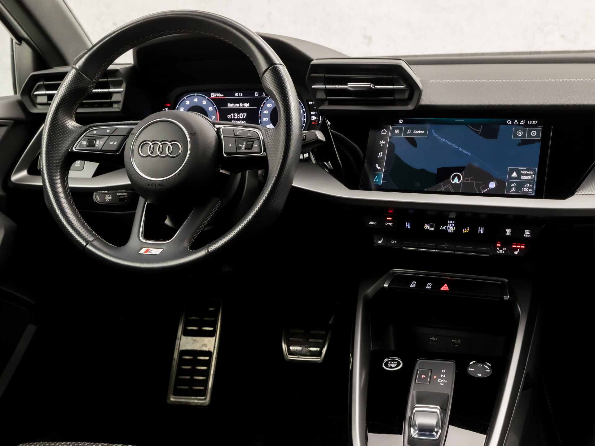 Voor het overzicht tijdens iedere rit is deze Audi A3 Sportback voorzien van een gemakkelijk afleesbaar digitaal dashboard. Adaptive cruise control is veilig en comfortabel. De snelheidsregelaar houdt automatisch afstand tot het voertuig dat voor u rijdt. Een smartphone met internetverbinding legt eenvoudig overal contact met de auto. U kunt functies activeren en de conditie van de auto monitoren. Onderweg kunt u veilig genieten van het audio-installatiesysteem met DAB-radio en het MMI navigatiesysteem. Want in deze Audi bedient u ze vanaf het stuurwiel. Smartphone opladen onderweg? Dat gaat supergemakkelijk door de draadloze oplaadmogelijkheid voor telefoons. En dan is deze auto ook nog eens voorzien van met leder bekleed dashboard, WIFI-hotspot, automatische airconditioning, sportstuur met schakelpaddels, parkeersensoren achter en regensensor.