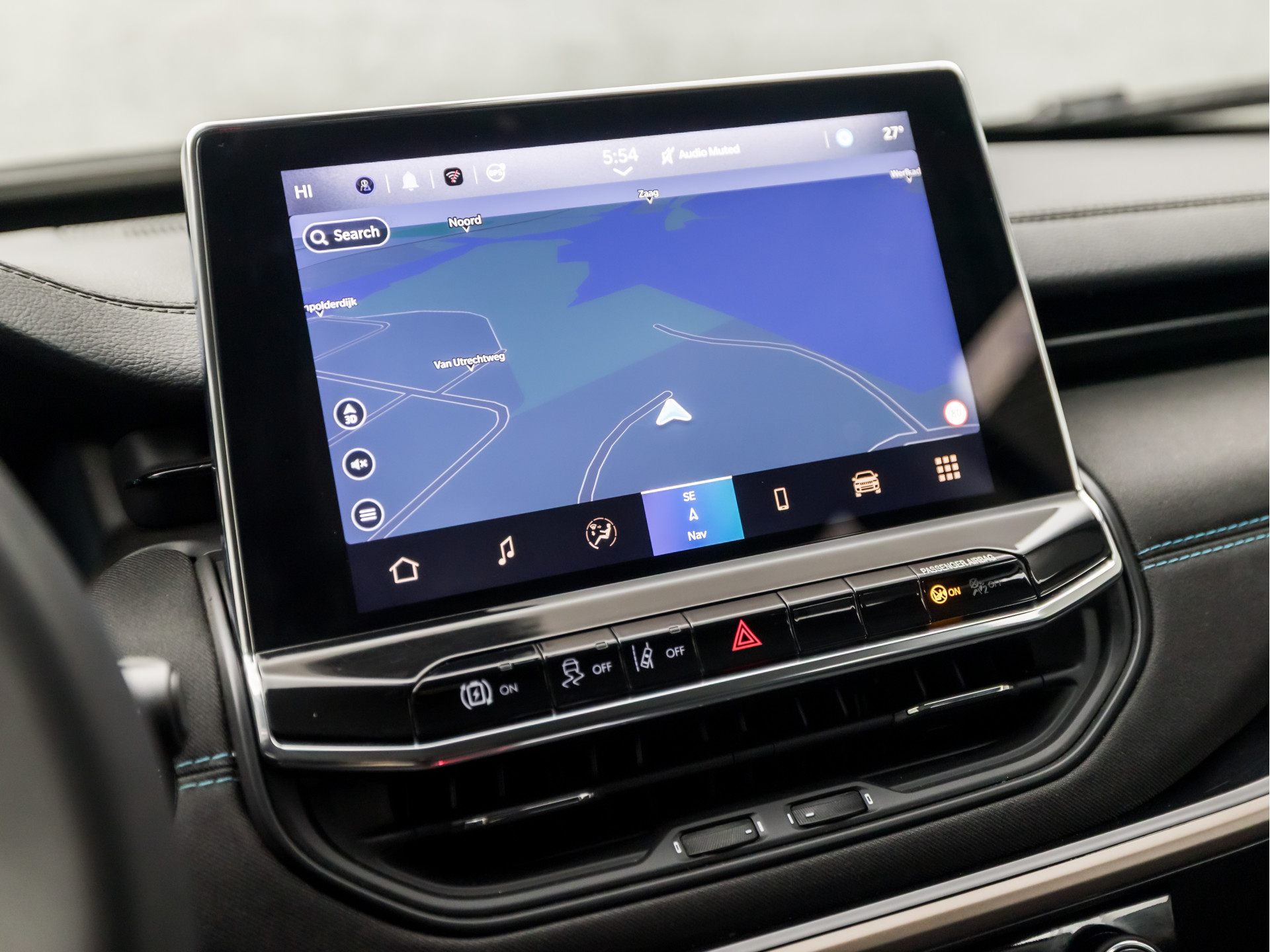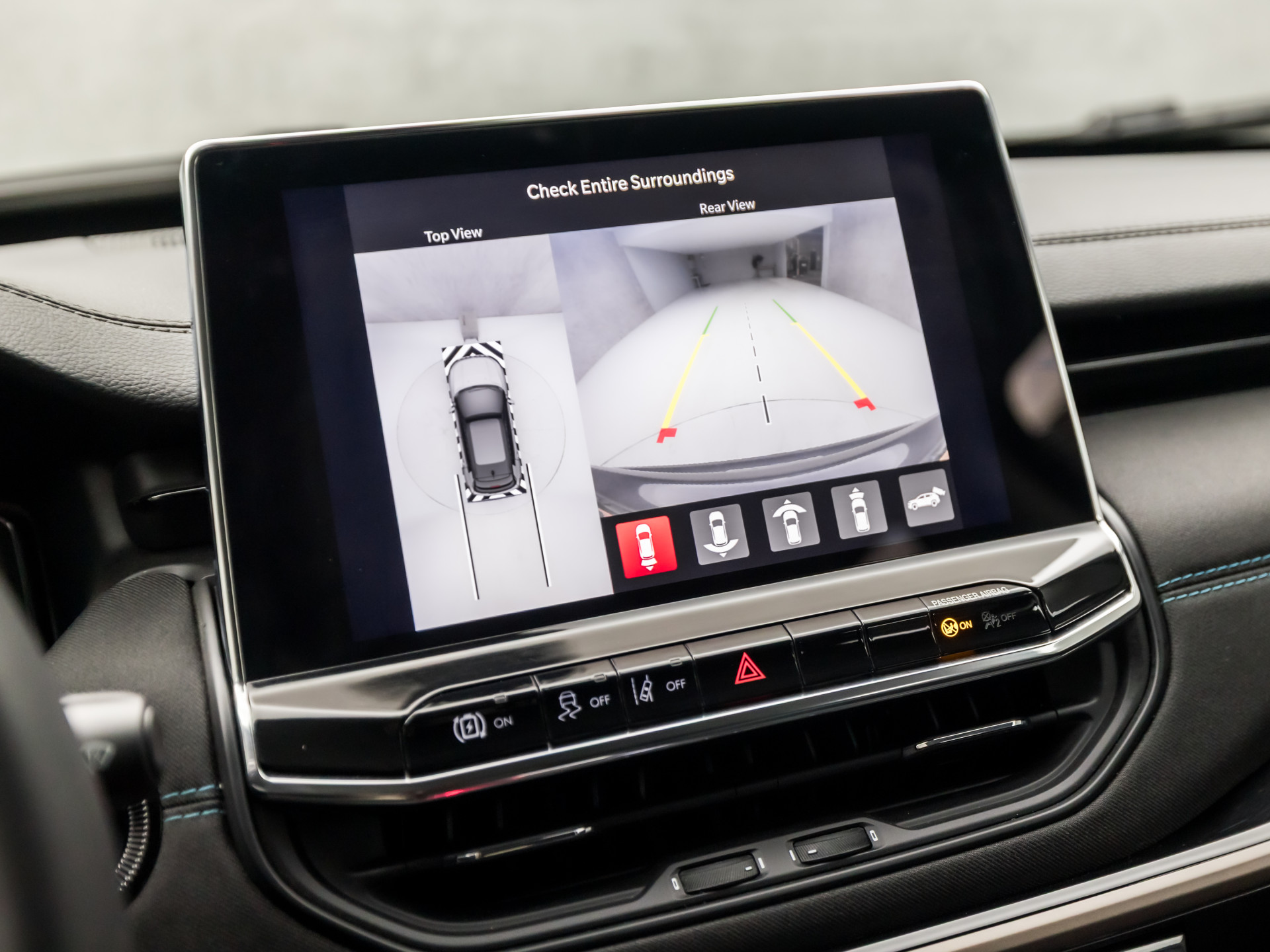 Aan boord van deze Jeep houden verschillende geavanceerde systemen voor u de weg in de gaten. Ze waarschuwen u voor noodsituaties en kunnen in een aantal gevallen ook zelf ingrijpen. Dat de auto steeds meer taken van de bestuurder overneemt, merkt u bijvoorbeeld aan het systeem voor verkeersbord-detectie in deze auto. Met het Lane-keeping systeem komt u nooit per ongeluk buiten de rijstrook. In een noodsituatie waarschuwt forward collision warning bij een dreigende aanrijding met een voorligger. In deze Jeep vinden we verder een dodehoekdetectie, hill hold functie, vermoeidheidsherkenning, autonoom remsysteem en bandenspanningcontrolesysteem.